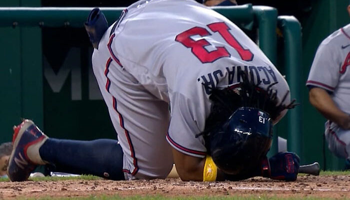 El estelar jardinero de Atlanta tuvo que abandonar el partido del viernes, luego que un foul le impactara en el tobillo, pero no perdió tiempo en regresar