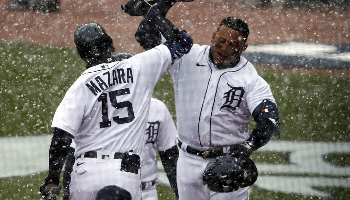 En medio de una nevada en Detroit, el slugger conectó un jonrón de dos carreras para guiar el triunfo de su equipo 3-2 contra los Indios de Cleveland