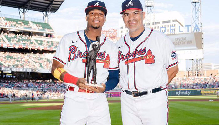 El jardinero de los Bravos de Atlanta obtuvo su estatuilla de manos del zuliano Eduardo Pérez, previo al juego del sábado ante los Filis de Filadelfia