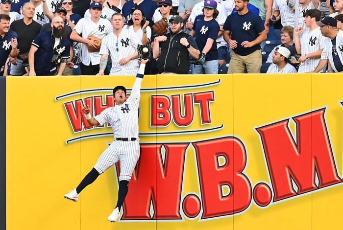 El novato procesó una lectura perfecta del batazo, lo ubicó y realizó la atrapa saltando en el momento justo, contra la pared. Una vez con la bola en el guante, celebró voz en cuello, regresó la pelota al cuadro, y chocó los cinco con su compañero Aaron Judge, que estaba cubriendo el center field.